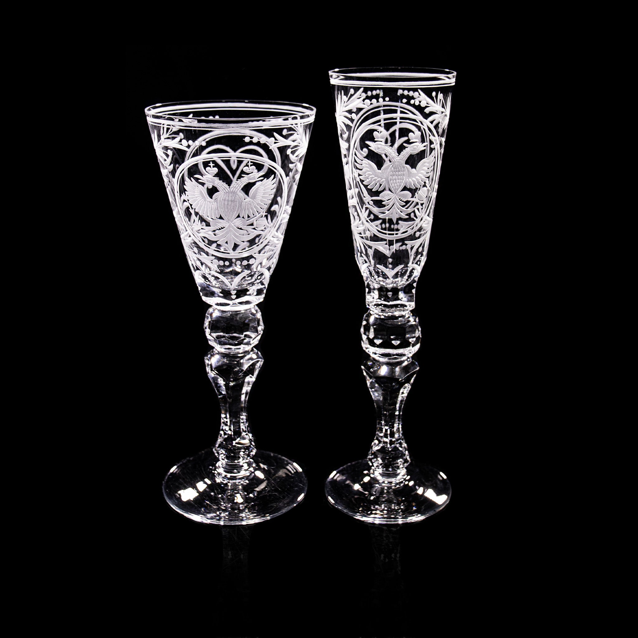 A true collector’s crystal set featuring a champagne flute and wine glass, adorned with the iconic double-headed eagle motif and intricate hand-etched detailing all around. A rare masterpiece of artistry and heritage, perfect for discerning crystal collectors.