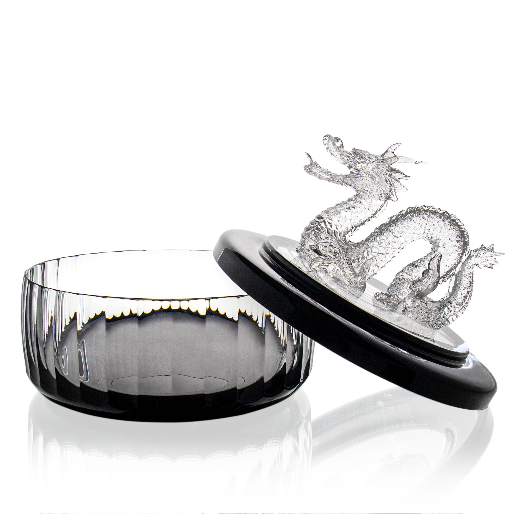 A striking, black crystal bowl, 28 cm / 11.2 in in diameter, with a fitted lid featuring an exceptionally rare dragon pâte-de-verre. Once showcased in the Ajka Crystal Museum, this monumental piece exemplifies masterful craftsmanship and intricate artistry—a dramatic centerpiece for discerning collectors.