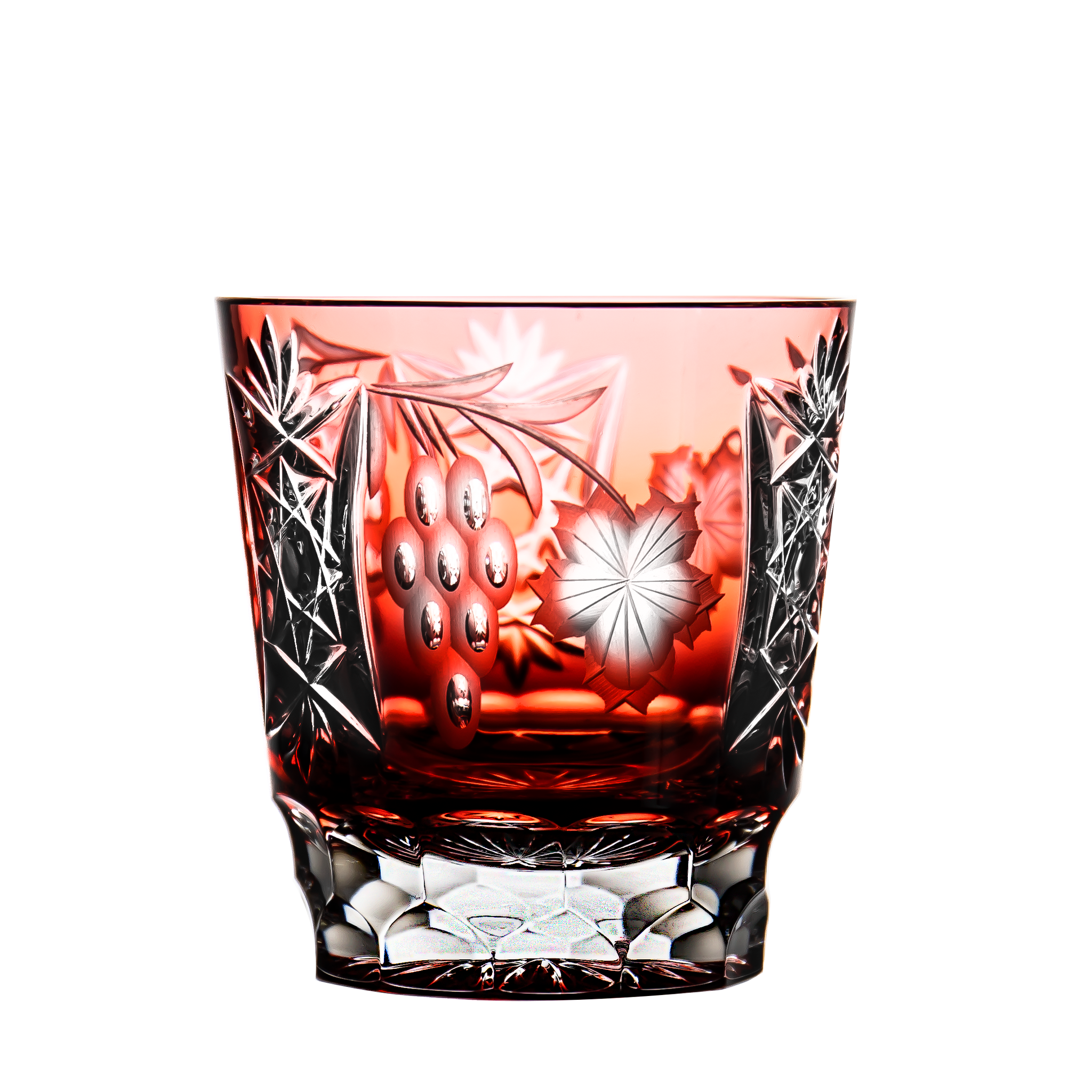Genuine cased coloured lead crystal glasses with a grape design. It is a hand-polished, mouth-blown unique product.
