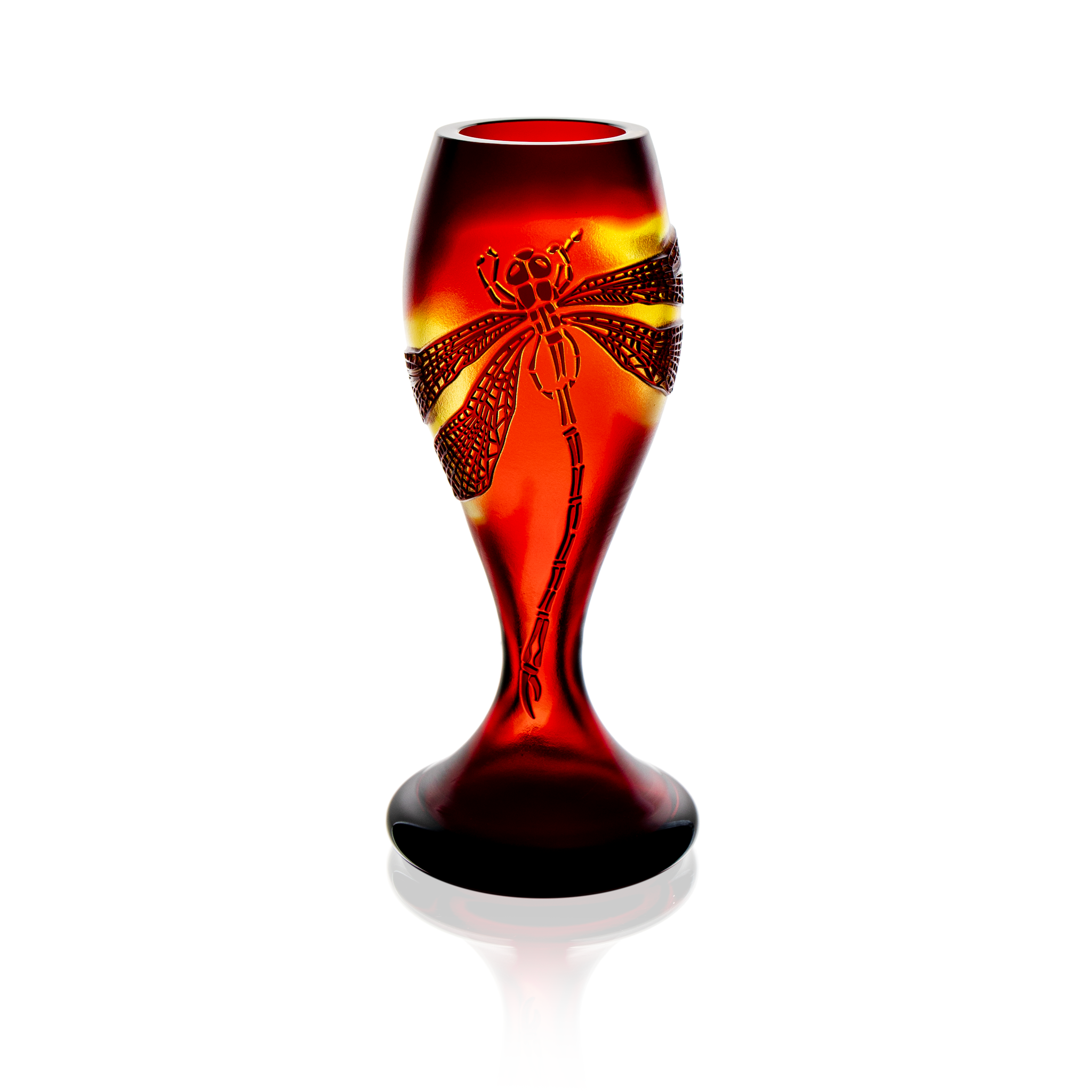 Elegant Double Cased vase in Ruby Red and Golden, featuring a finely carved Dragonfly motif. Graceful silhouette with rich color depth and luminous contrast.