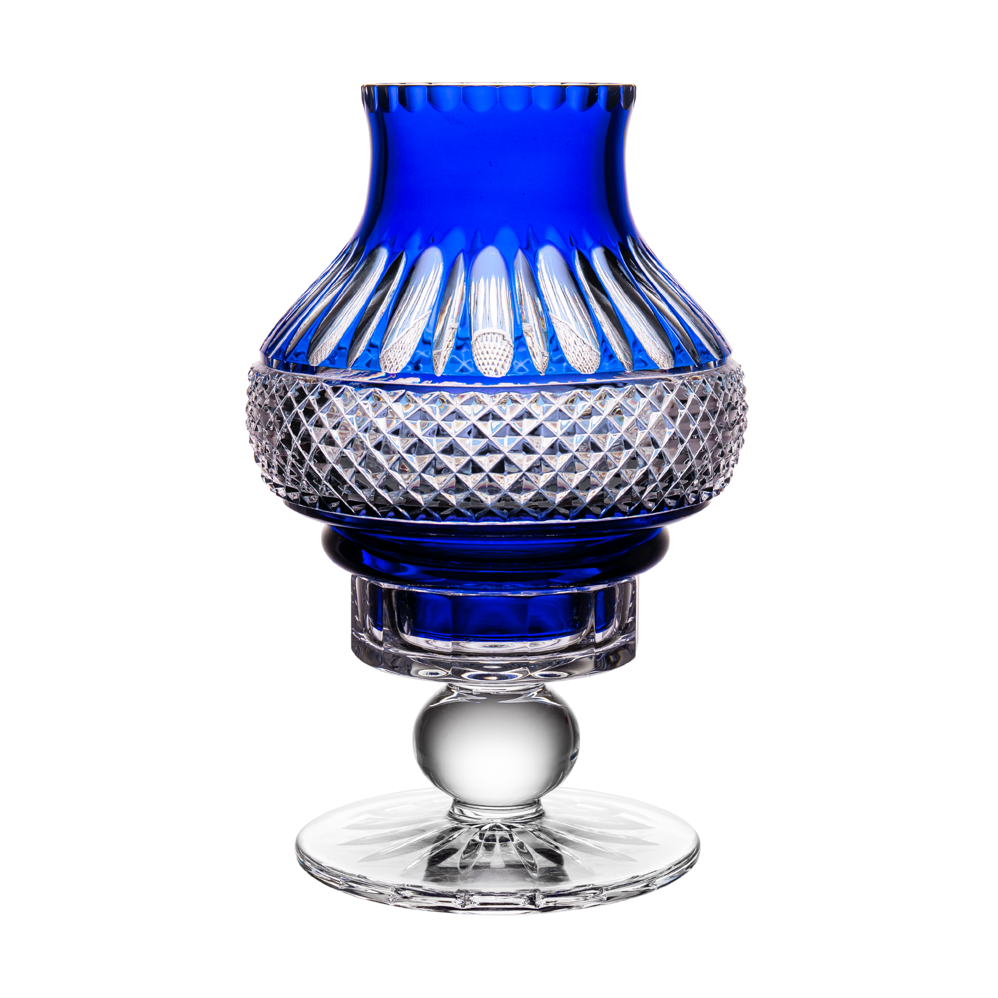This exquisite blue crystal lamp showcases timeless design with intricate detailing. The rich cobalt blue glass is accented by finely cut crystal patterns, creating a harmonious blend of elegance and refinement. Perfect as a decorative piece or functional lighting, it adds a touch of luxury to any space.
