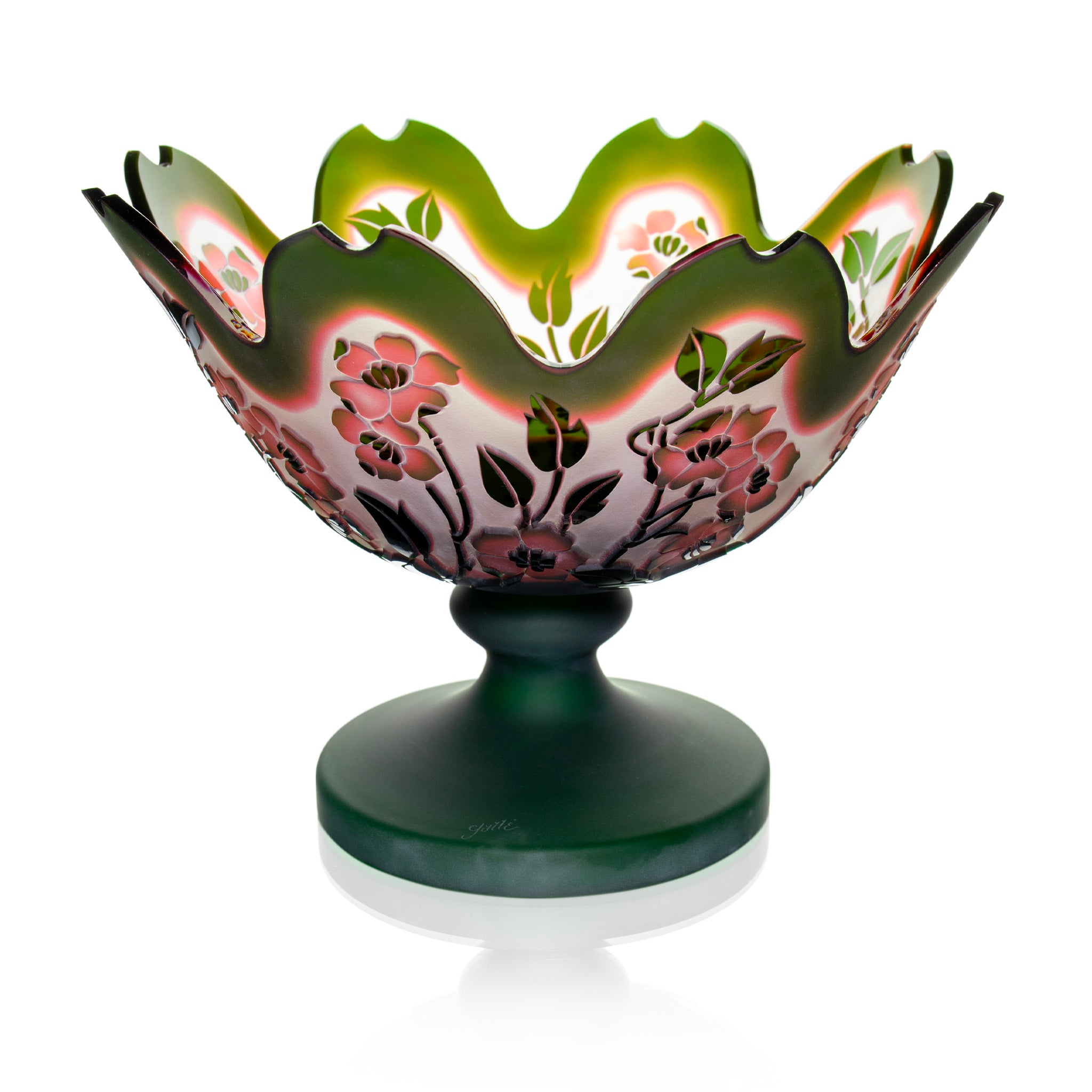 Rare, hand-cut double cased lead crystal bowl. Features beautiful green and pink floral intricate cut-through design showcasing the layers of color.