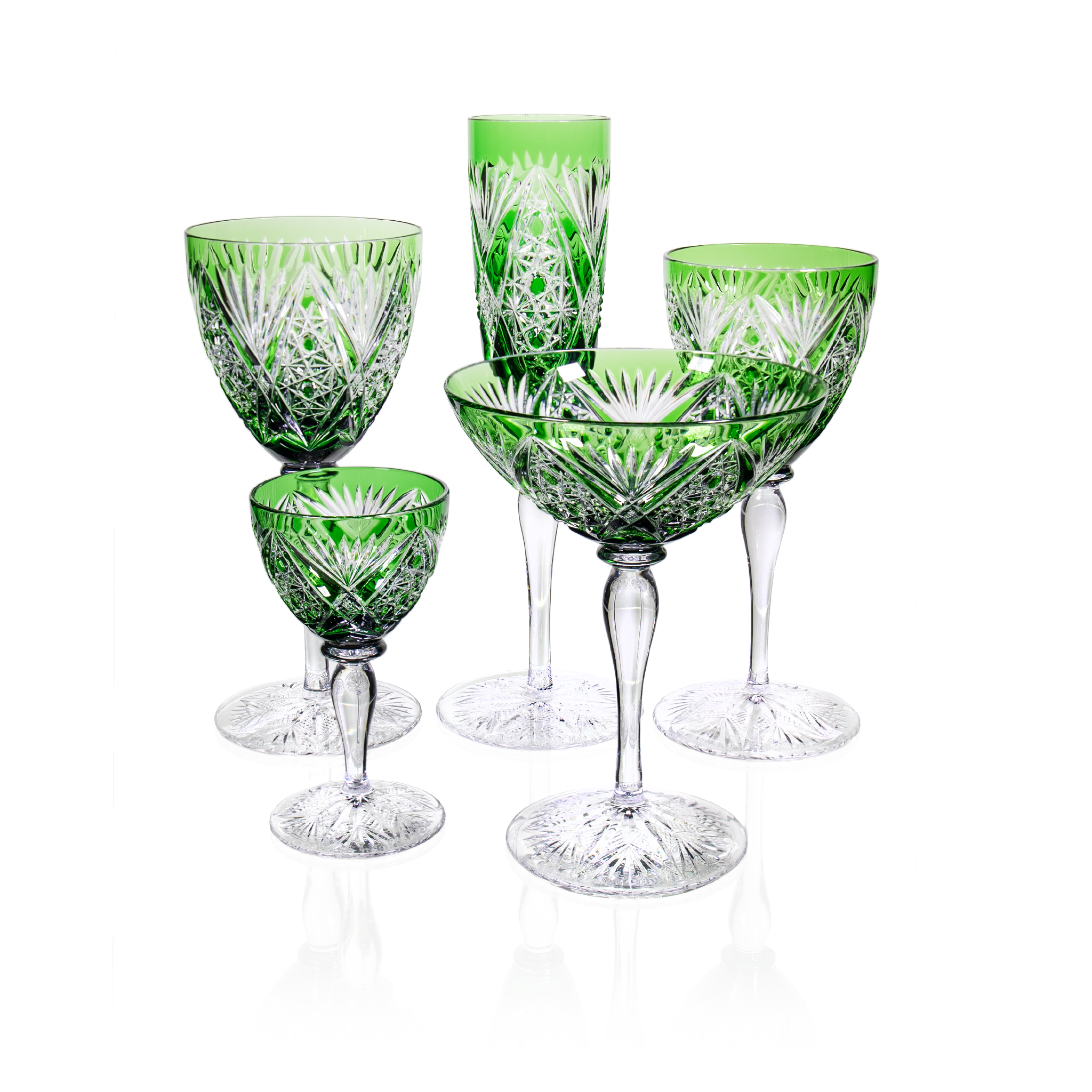 Ajka Crystal green stemware set (early 2000s) with Champagne Flute, Water Goblet, Wine Glass, Cordial, and Martini Glass. Intricate detailing and graceful silhouettes offer timeless elegance, ideal for special occasions or gifting.